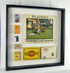 Players Country Life cigarette display (1920s), Gold Flake tin, Wills STAR cigarettes box, Bryant & May match box.